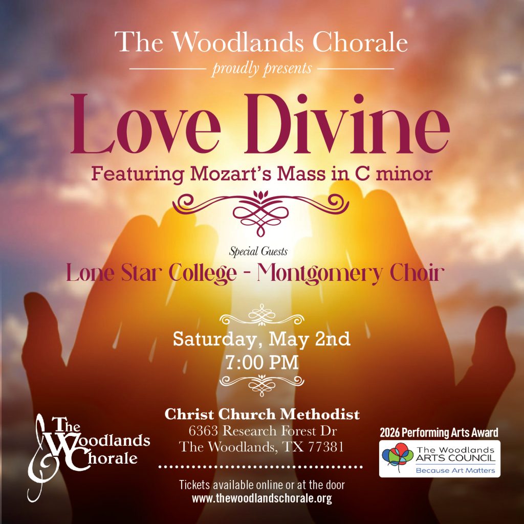Join The Woodlands Chorale for an inspiring Spring concert featuring one of the great masterpieces of sacred choral music: Mozart’s Mass in C minor. Rich with drama, beauty, and profound expression, this monumental work showcases Mozart at the height of his creative power and offers an unforgettable experience for singers and audiences alike.